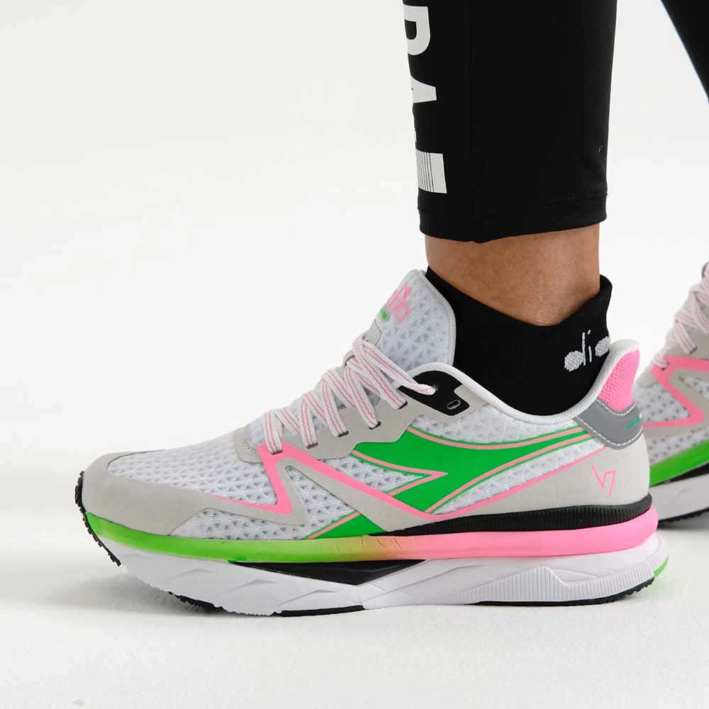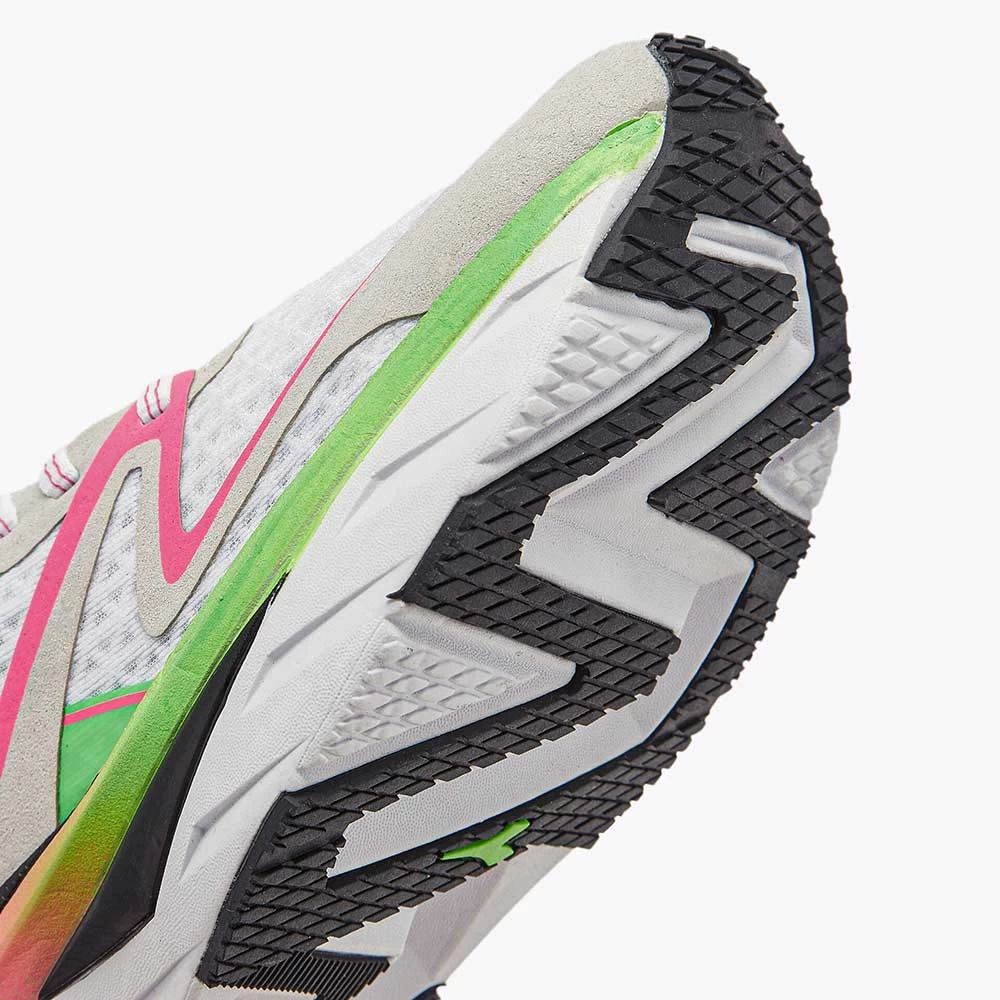 The Atomo V7000 stands out with its responsiveness and lightweight. The made-in-Italy “equipe atomo ” project is the utmost expression of the Diadora brand’s uniqueness in a max cushion, lightweight, neutral trainer.